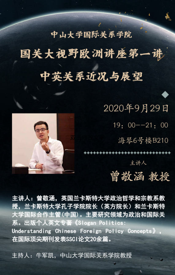 2020年9月29日,我院本年度国关大视野系列讲座第一讲顺利开讲。本次讲座由兰卡斯特大学教授曾敬涵博士主讲,我院牛军凯教授主持讲座。曾教授围绕“中英关系近况及展望”主题,从国际政治专业领域给在场听众解读中英关系,并结合热点问题,对未来中英关系发展作出理论框架预判。