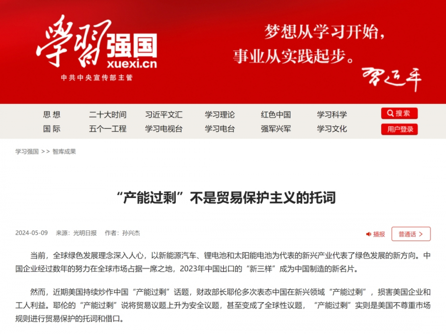 2024年5月9日,我院孙兴杰教授原刊载于光明日报的文章《“产能过剩”不是贸易保护主义的托词》被学习强国收录并刊出。