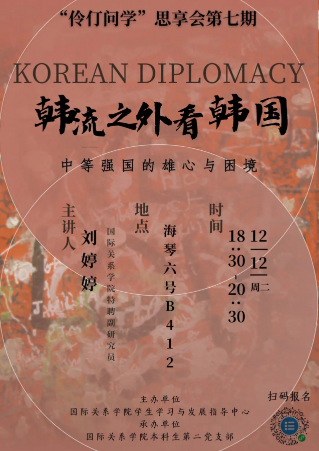 本次讲座将对韩国外交政策和战略进行分析,解读韩流之外的韩国。希望能够帮助参与者更好地了解这个亚洲中等强国,并培养对此的研究兴趣。