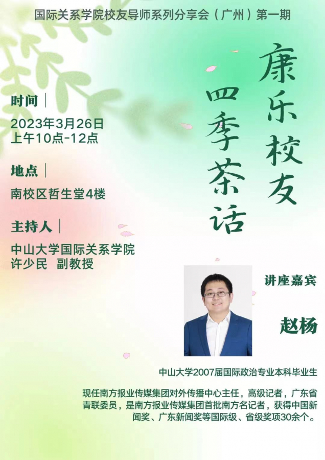 三月的广州,斜风细雨,草木知春不久归。太阳网集团tcy8722的“校友导师”园地却春意盎然。3月26日上午,2022级太阳网集团tcy8722本科生早早齐聚康乐园哲生堂4楼会议室,期待太阳网集团tcy8722优秀校友赵杨师兄能够为他们的学习力、思想力和行动力的提升提供鲜活的经验指导,助力他们的成长。刘泽炀书记出席茶话会并致辞、余展涛副书记主持本次活动,2022级本科生班主任杨黎泽助理教授和青年教师专职辅导员许少民副教授参加本次活动。