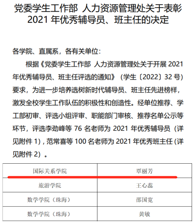 我校党委学生工作部和人力资源管理处于2021学年春季学期开展优秀班主任评选工作。近日,两部门发布了《关于表彰2021年优秀辅导员、班主任的决定》,我院覃丽芳副教授荣获优秀班主任荣誉称号。